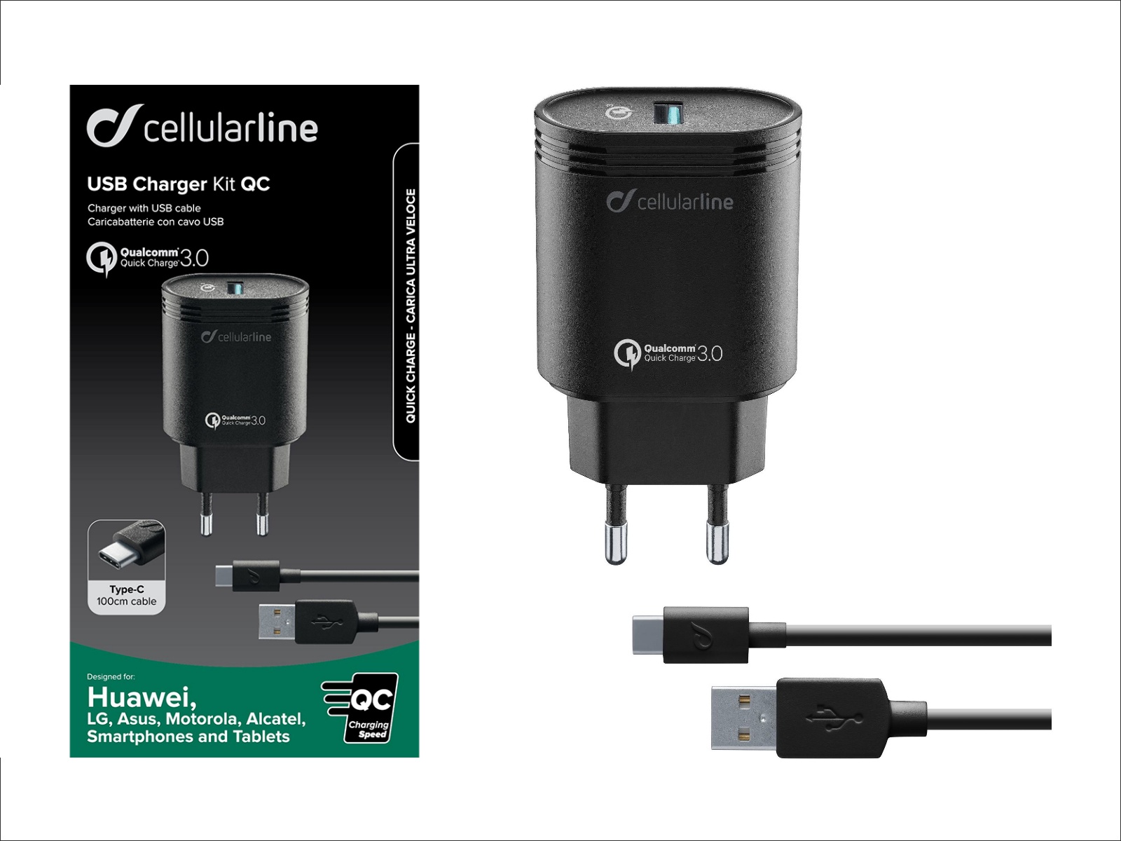 cellularline Charger USB Kit QC Type-C Adapter für Steckdosen, Überladungs- & Kurzschluss Schutz, 1m